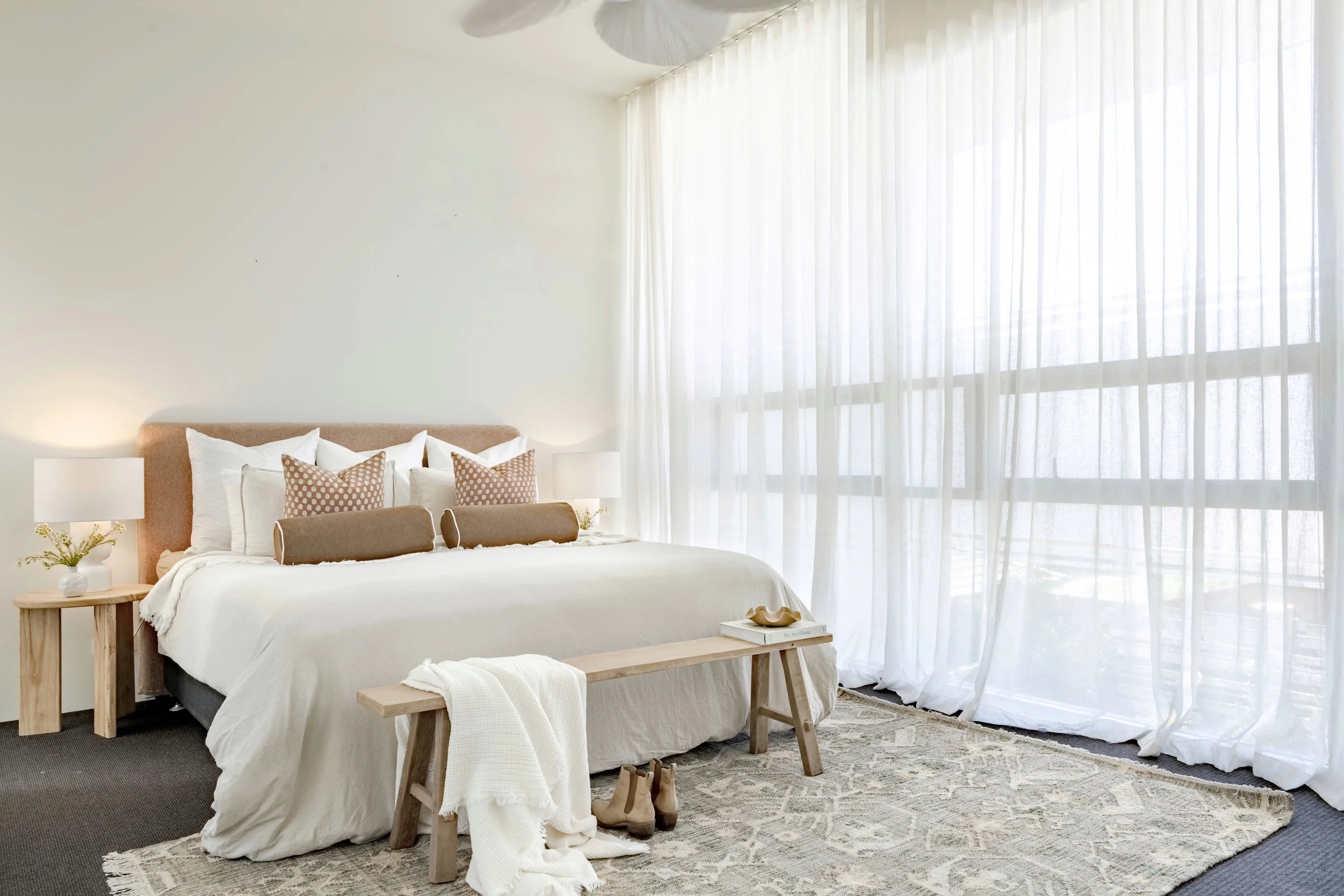 The team at Right At Home Staging collaborated with dollar curtains + blinds Merimbula to select our custom made Sheer Curtains, which beautifully enhanced the home's airy, relaxed feel, along with Roller Blinds for added practicality.