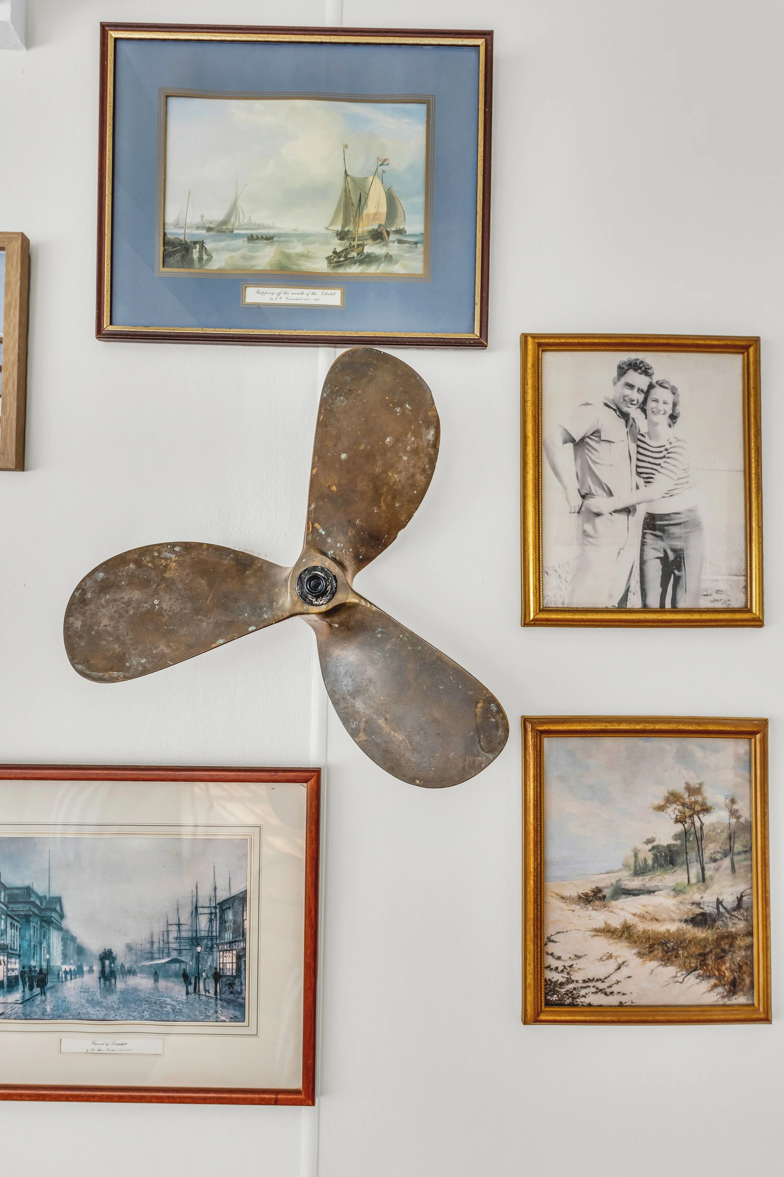 Thoughtful details, like a vintage propeller, framed family photos, and nautical-themed décor, honour the property’s rich history.